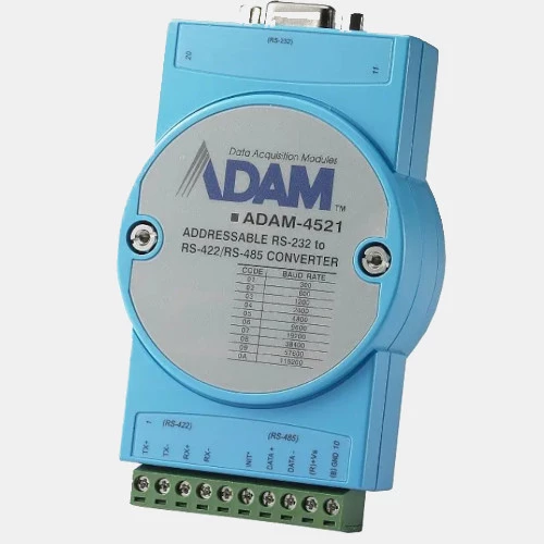Adresowalny konwerter RS-232 do RS-422/485 ADAM-4521-AE ,marki Advantech o napięciu zasilania 10...30 V DC. Pobór mocy dla tego urządzenia wynosi 1W. Urządzenie konwertuje sygnały RS232 do sygnałów różnicowych RS-422/485. Producent podaje szybkość transmisji danych dla konwertera ADAM-4521-AE na poziomie od 1200 b/s do 115,2 Kb/s. Dodatkowo urządzenie dysponuje wbudowana pamięcią FIFO (o ograniczonej pojemności) umożliwiającą ustawienie różnych prędkości transmisji danych na poszczególnych interfejsach. Adresowalny konwerter wyposażony jest w złącze interfejsu RS232 w DB9 żeńskie oraz złącza interfejsu RS485/422 i zasilania w terminali zaciskowych śrubowych. Konwerter ADAM-4521-AE z optoizolacją o temperaturze pracy od -10 do +70 stopni Celsjusza.