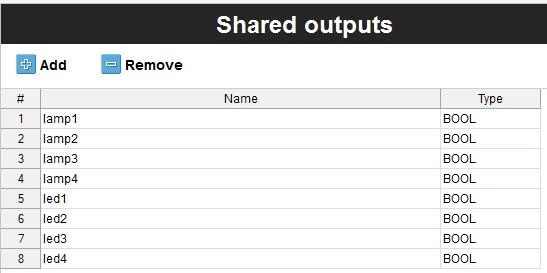 Zmiana możliwości wymiany informacji o stanie wejść/wyjść możliwa jest po dodaniu ich do tabel „Shared variables” - „Inputs” oraz „Outputs”. W przypadku wyjść pierwsze cztery odpowiadają za wyjścia przekaźnikowe, kolejne cztery za diody LED znajdujące się na obudowie przekaźnika. Tabele z dodanymi wejściami i wyjściami przestawiają poniższe rysunki.