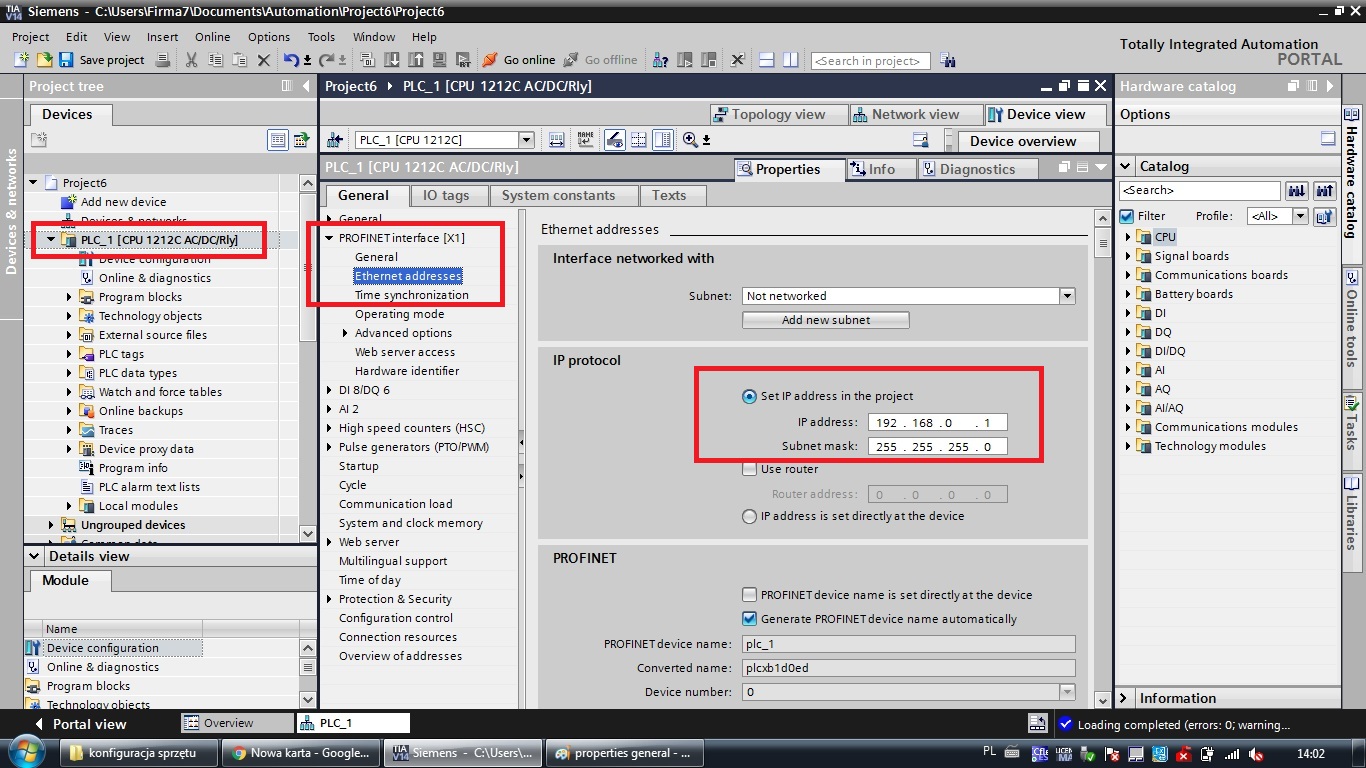 Kolejnym krokiem który należy wykonać jest sprawdzenie czy nasz sterownik posiada ustawiony adres IP. Możemy tego dokonać poprzez kliknięcie prawym przyciskiem myszy na urządzenie w drzewie, a następnie wybranie zakładki "Properties". Wybieramy zakładkę "Profinet" i kolejno "Ethernet addresses". Teraz należy należy uzupełnić pola "IP Adress" oraz "Subnet mask" o IP oraz maskę sterownika.