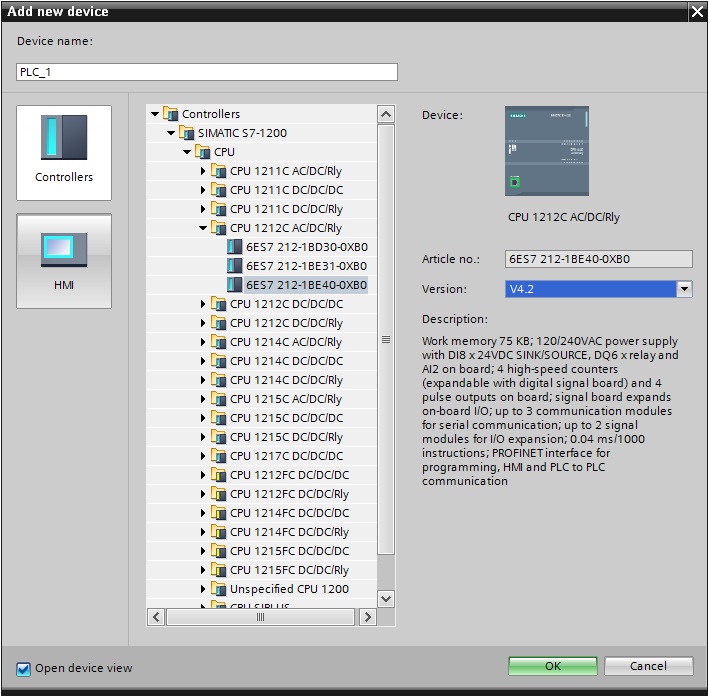 W oknie, które pojawi się na naszym ekranie wybieramy kategorię - w tym przypadku "Controlers" (Sterowniki). Następnie w drzewie wybieramy dokładny model naszego urządzenia odczytany z tabliczki znamionowej znajdującej się na jego boku ( w naszym przypadku: SIMATIC S7-1200, CPU 1212C AC/CD/Rly, 6ES7212-1BE40-0XB0).