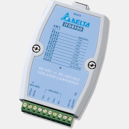 Konwerter izolowany IFD8500 producenta Delta Electronics zasilany jest napięciem mieszczącym się w przedziale 9...48 V DC i pobiera moc 1,2 W. Urządzenie konwertuje sygnały RS232 do sygnałów różnicowych RS422/RS485. IFD8500 zapewnia automatyczne wykrywanie i konfigurowanie protokołów komunikacyjnych. Konwerter przemysłowy portu szeregowego RS232 Delta wyposażony jest w 9 pinowe złącze żeńskie D-SUB oraz dysponuje szybkością transmisji do 115200 bps. Obudowa konwertera szeregowego jest całościowo izolowana. Wykonana została w kompaktowych wymiarach 118 x 71 x 22 mm.