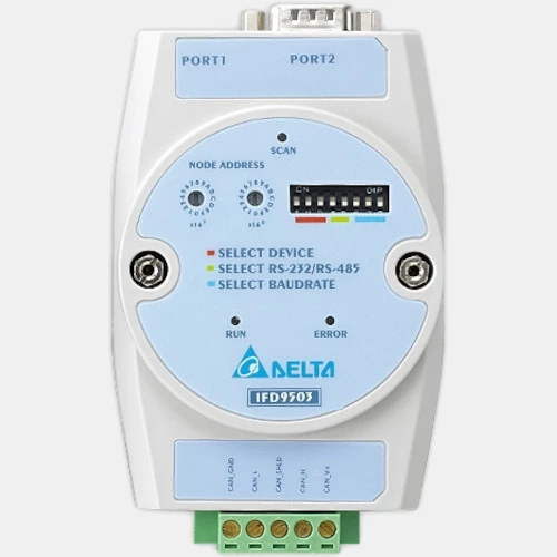 Konwerter komunikacyjny IFD9503 producenta Delta Electronics zasilany jest napięciem 24 V DC. IFD9503 zapewnia automatyczne wykrywanie i konfigurowanie protokołów komunikacyjnych. Konwerter przemysłowy CANopen Delta wyposażony jest w 9 pinowe złącze męskie D-SUB oraz dysponuje szybkością transmisji od 10kbps do 1 Mbps. Obudowa urządzenia jest całościowo izolowana. Wykonana została w kompaktowych wymiarach 102 x 71 x 22 mm. Atutem konwertera komunikacyjnego CANopen jest możliwość podłączenia dowolnego urządzenia Delta Electronics.