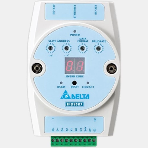 Konwerter komunikacyjny IFD9507 producenta Delta Electronics zasilany jest napięciem 24 V DC. IFD9507 zapewnia automatyczne wykrywanie i konfigurowanie protokołów komunikacyjnych. Konwerter przemysłowy CANopen Delta wyposażony jest w 9 pinowe złącze męskie D-SUB oraz dysponuje szybkością transmisji od 10kbps do 1 Mbps. Ponadto posiada port szeregowy Virtual COM oraz sygnalizacje alarmowa e-mail. Obudowa urządzenia jest całościowo izolowana. Wykonana została w kompaktowych wymiarach 102 x 71 x 22 mm. Atutem konwertera komunikacyjnego EthernetNET/IP jest możliwość konfiguracji z przeglądarki internetowej oraz monitoring on-line.