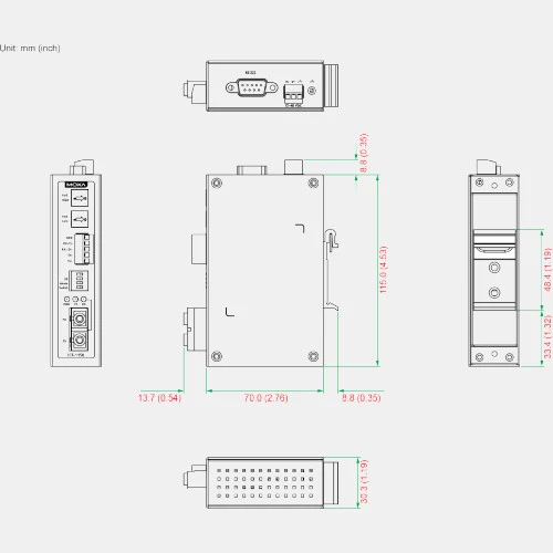 Kompaktowa obudowa konwertera portów szeregowych ICF-1150 została wykonana z aluminium i przystosowana do montażu na szynie DIN.