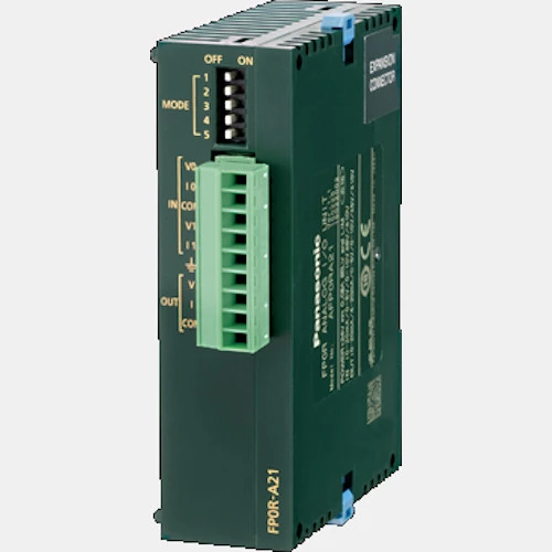 Moduł analogowy AFP0RA21 przeznaczony do współpracy ze sterownikami PLC Mitsubishi FP0R. Rozszerzenie pozwala na rozbudowanie możliwości jednostki głównej o 2 wejścia analogowe prądowo-napięciowe oraz 1 wyjście prądowo-napięciowe. Rozdzielczość punktów analogowych w tym module analogowym wynosi 14 bit. Producent podaje szybkość transmisji dla wejść analogowych na poziomie 2ms/kanał oraz 500us/k dla wyjść analogowych. Rozszerzenie analogowe AFP0RA21 dysponuje kompaktową obudową o stopniu ochrony IP20 oraz wymiarach 90 x 25 x 60 mm.