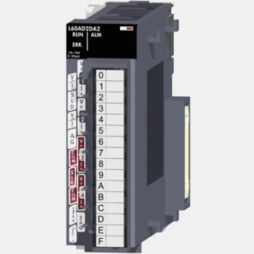 Moduł L60AD2DA2 przeznaczony do współpracy ze sterownikami PLC Mitsubishi MELSEC-L. Rozszerzenie pozwala rozbudować możliwości sterownika o 2 wejścia i 2 wyjścia analogowe prądowo-napięciowe. Rozszerzenie analogowe MELSEC-L charakteryzuje się wysoką dokładnością przetwarzania oraz dużą szybkością przetwarzania. Atutem tych modułów jest prosta nastawa parametrów. Moduł MELSEC-L 269673 został wyposażony w 18-punktową wymienną listwę zaciskową. Kompaktowa obudowa modułu L60AD2DA2 o stopniu ochrony IP20 posiada wymiar: 28,5 x 90 x 117 mmi wagę 200 gram. Producent zaleca stosowanie do modułu analogowego MELSEC-L L60AD2DA2 przewodów o przekroju 0,3 - 0,75mm2.