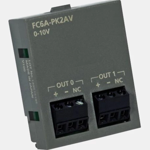 Moduł wyjść analogowych FC6A-PK2AV dedykowany do rozbudowy sterowników PLC FC6A IDEC. Kaseta analogowa przystosowana jest do instalowania od frontu jednostki głównej. Płytka FC6A-PK2AV została wyposażona w 2 wyjścia analogowe 0...10V. Urządzenie zasilane jest napięciem 24 VDC. Rozszerzenie analogowe Idec FC6A-PK2AV posiada obudowę z tworzywa o stopniu ochrony IP20 i wymiarach 44,6 x 34,8 x 12,5 mm. Waga płytki FC6A wynosi 15 g. Producent deklaruje możliwość pracy urządzenia w zakresie temperatur od -10 do +55 stopni Celsjusza.
