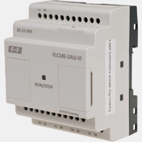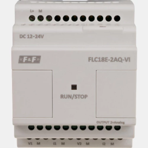 Moduł analogowy FLC18E-2AQ-VI producenta F&F dysponuje 2 wyjściami analogowymi napięciowymi 0...10V o rozdzielczości 9bit i prądowymi 0...20 mA o rozdzielczości 10 bit. FLC18E-2AQ-VI F&F zasilany jest napięciem 24V DC i pobiera moc w wysokości 1,8 W. Moduł PLC F&F został zaprojektowany w kompaktowej obudowie o wymiarach 90 x 71,5 x 57,9 mm, której stopień ochrony producent podaje na IP20. Moduł PLC F&F przystosowany jest do pracy w temperaturze od -20...55 stopni Celsjusza. Przeznaczony do bezpośredniego montażu na szynę DIN. Moduł rozszerzeń FLC18E-2AQ-VI dedykowany jest jako rozszerzenie do PLC F&F instalowany z prawej strony jednostki głównej.