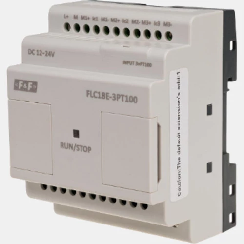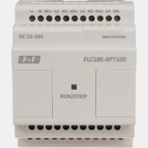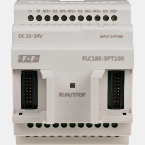Moduł PT100 FLC18E-3PT100 producenta F&F dysponuje 3 wyjściami temperaturowymi dla czujników PT100 o rozdzielczości 12 bitów z podłączeniem 2 lub 3 przewodowym. FLC18E-3PT100 F&F zasilany jest napięciem 24V DC i pobiera moc w wysokości 1 W. Moduł PLC F&F został zaprojektowany w kompaktowej obudowie o wymiarach 90 x 71,5 x 57,9 mm, której stopień ochrony producent podaje na IP20. Moduł PLC F&F przystosowany jest do pracy w temperaturze od -20...55 stopni Celsjusza. Przeznaczony do bezpośredniego montażu na szynę DIN. Moduł rozszerzeń FLC18E-3PT100 dedykowany jest jako rozszerzenie do PLC F&F instalowany z prawej strony jednostki głównej.