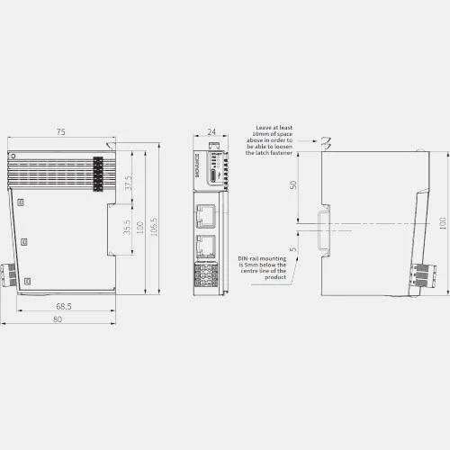 Kompaktowa obudowa rozszerzenia GL20-3200END została przystosowana do montażu na szynie DIN a jej wymiar to: 100x24x75mm. Moduł posiada zaciski śrubowe oraz demontowane zaciski sprężynowe.