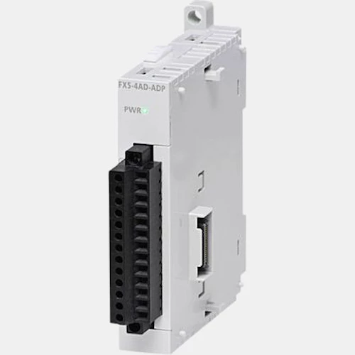 Moduł analogowy FX5-4AD-ADP dedykowany dla sterowników PLC Melsec-FX Mitsubishi Electric. Adapter dysponuje 4 wejściami analogowymi prądowo-napięciowymi o rozdzielczości 14 bit. Moduł wejść analogowy Melsec F FX-4AD-ADP zasilany jest napięciem 24 V DC oraz instalowany jest z lewej strony jednostki głównej. Rozszerzenie analogowe Melsec iQ-F zostało wyposażone w obudowę z tworzywa o wymiarach: 90 x 17 x 89 mm i wadze 100 gr. Producent deklaruje możliwość pracy modułu FX5-4AD-ADP w zakresie temperatur -20...55 stopni Celsjusza.