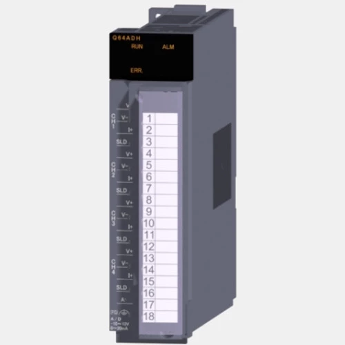 Moduł Q64ADH dedykowany jest do współpracy ze sterownikami PLC Mitsubishi Electric Melsec-Q. Rozszerzenie pozwala na rozbudowanie możliwości CPU o 4 wejścia analogowe prądowo-napięciowe o rozdzielczości 16bit. Ponadto zaciski wejściowe zostały odizolowane za pomocą transoptorów. Moduł analogowy 251331 został wyposażony w listwę zaciskową z 18 zaciskami śrubowymi. Mitsubishi zaleca stosowanie dla rozszerzenia Q64ADH przewodów o przekroju 0,3...0,75mm2. Obudowa modułu wejść analogowych Melsec Q 251331 została wykonana z tworzywa, a jej wymiary to: 27,4x98x90mm. Waga modułu Q64ADH wynosi 0,18 kg.