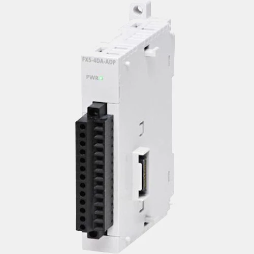 Moduł analogowy FX5-4DA-ADP dedykowany dla sterowników PLC Melsec-FX Mitsubishi Electric. Adapter dysponuje 4 wyjściami analogowymi prądowo-napięciowymi o rozdzielczości 14 bit. Moduł wejść analogowy Melsec F FX-4DA-ADP zasilany jest napięciem 24 V DC oraz instalowany jest z lewej strony jednostki głównej. Rozszerzenie analogowe Melsec iQ-F zostało wyposażone w obudowę z tworzywa o wymiarach: 90 x 17 x 89 mm i wadze 100 gr. Producent deklaruje możliwość pracy modułu FX5-4DA-ADP w zakresie temperatur -20...55 stopni Celsjusza.