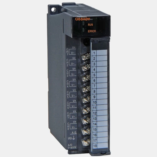 Moduł Q68ADV dedykowany jest do współpracy ze sterownikami PLC Mitsubishi Electric Melsec-Q. Rozszerzenie pozwala na rozbudowanie możliwości CPU o 8 wejść analogowych napięciowych o rozdzielczości 16bit. Ponadto zaciski wejściowe zostały odizolowane za pomocą transoptorów. Moduł analogowy 129616 został wyposażony w listwę zaciskową z 18 zaciskami śrubowymi. Mitsubishi zaleca stosowanie dla rozszerzenia Q68ADV przewodów o przekroju 0,3...0,75mm2. Obudowa modułu wejść analogowych Melsec Q 251331 została wykonana z tworzywa, a jej wymiary to: 27,4x98x90mm. Waga modułu Q68ADV wynosi 0,19 kg.