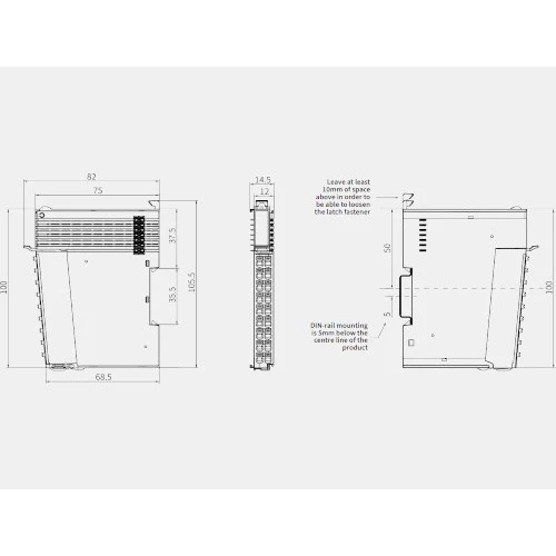 Kompaktowa obudowa rozszerzenia GL20-0800END została przystosowana do montażu na szynie DIN a jej wymiar to: 100x14,5x75mm. Moduł posiada zaciski śrubowe oraz demontowane zaciski sprężynowe.