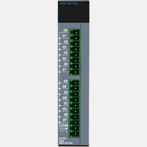 Moduł binarny XBE-DC16A XBE LG zasilany napięciem mieszczącym się w przedziale 20,4...28,8V DC. XBE-DC16A wyposażony został w 16 wejść binarnych i pobiera prąd w wysokości 0,04 A. Moduł rozszerzający XBE-DC16A XBE LS/LG dedykowany jest do rozszerzenia jednostki głównej STANDARD, HIGH, ULTRA oraz SLIM. Moduł 16 wejść LS montowany na bocznej ścianie sterownika PLC.