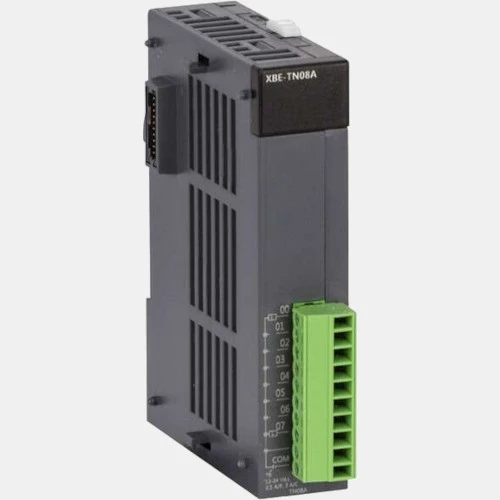 Moduł binarny XBE-TN08A XBE LG zasilany napięciem mieszczącym się w przedziale 20,4...28,8V DC. XBE-TN08A wyposażony został w 8 wyjść tranzystorowych NPN i pobiera prąd w wysokości 0,04 A. Moduł rozszerzający XBE-TN08A XBE LS/LG dedykowany jest do rozszerzenia jednostki głównej STANDARD, HIGH, ULTRA oraz SLIM. Moduł 8 wyjść tranzystorowych NPN LS montowany na bocznej ścianie sterownika PLC.