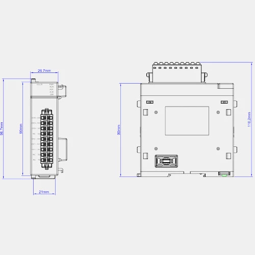 Moduł Fatek M02LCR posiada kompaktową obudowę o wymiarach: 27x90x110 mm.