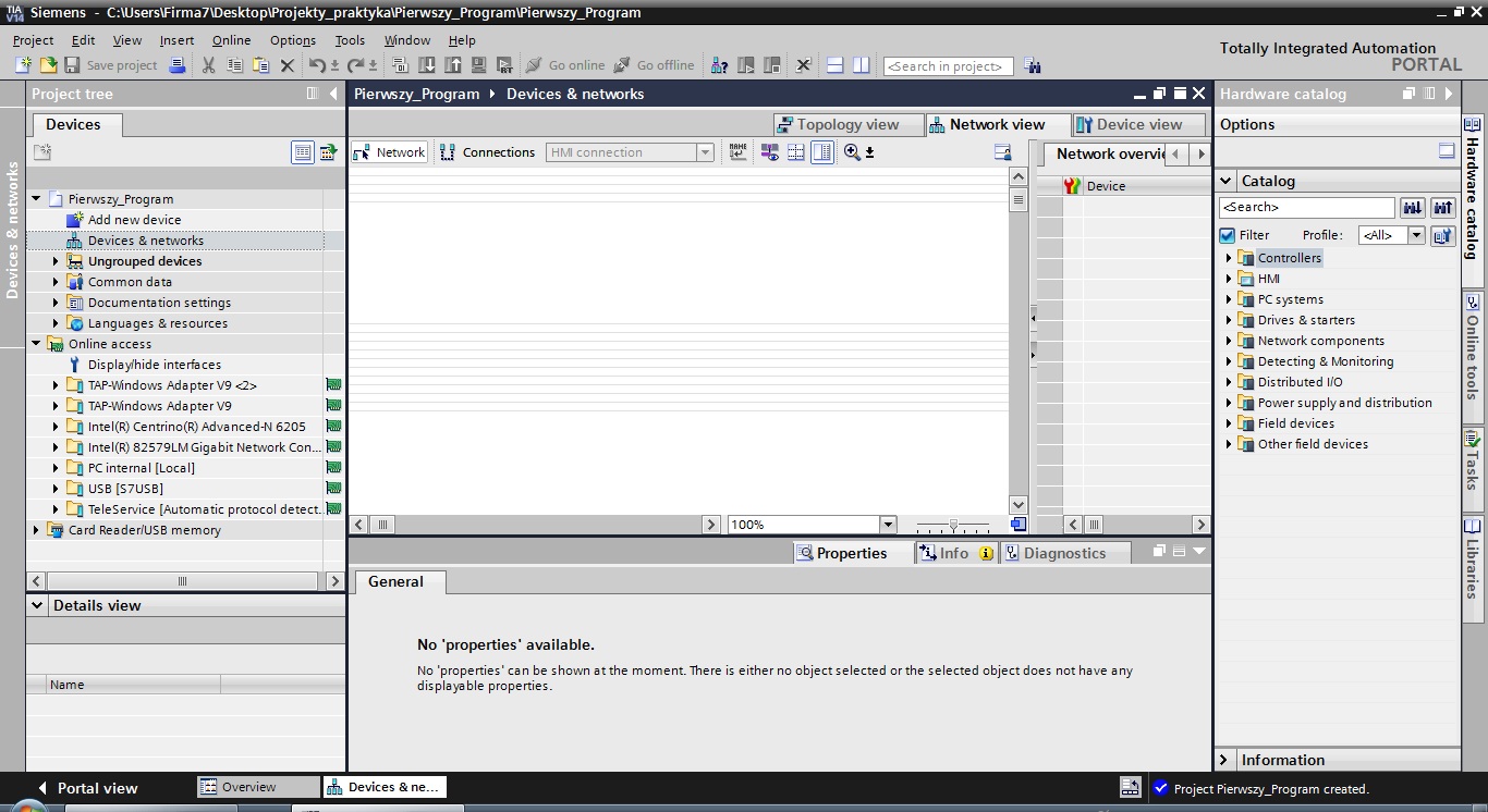 I już!? TAK, pierwszy projekt został stworzony. Jak widać założenie projektu w TIA portal jest banalnie proste, wystarczy tylko kilka kliknięć. Teraz możemy przejść do konfiguracji sprzętu.