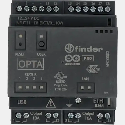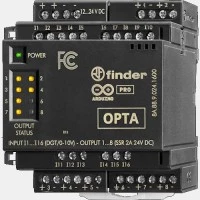 Sterownik PRL 8A.04.9.024.8300 Finder zasilany jest napięciem 12...24VDC. Urządzenie zostało wyposażone w 8 wejść binarnych, które mogą pracować jako analogowe napięciowe oraz w 4 wyjścia przekaźnikowe 10A. Przekaźnik programowalny logicznie 8A.04.9.024.8300 dysponuje portem USB typ C, port RJ45 dla sieci Ethernet oraz Modbus TCP/IP. Ponadto producent wyposażył PRL OPTA w wskaźnik zadziałania do każdego z wyjść w postaci diody LED. Urządzenia dysponują pamięcią flash 2 MB int + 16 MB flash QSPI. Sterownik PRL OPTA LITE Finder można programować przy pomocy następujących języków: Arduino IDE, LD, SFC, FBD, ST oraz IL. Przekaźnik programowalny OPTA LITE 8A.04.9.024.8300 ma kompaktową obudowę z tworzywa przystosowaną do montażu na szynie DIN oraz wymiarach: 88,8 x 70 x 56,8 mm.