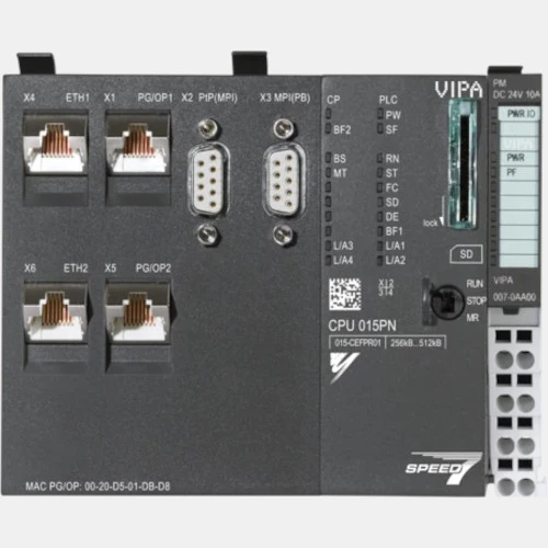 Sterownik PLC 015-CEFPR01 Yaskawa wyposażony w 2 porty szeregowe RS485, Ethernet, ModbusTCP, open Communication, I-Device, PROFINET IO controller. Pamięć robocza urządzenia wynosi 256...512 KB. Ponadto PLC 015-CEFPR01 Yaskawa został wyposażony w slot kart SD, możliwość rozbudowy do 64 modułów rozszerzeń. Jednostka centralna posiada funkcję OPC UA server oraz Web server. Konfiguracja PLC SLIO VIPA odbywa się przy pomocy SPEED7 Studio, SIMATIC Manager i TIA Portal. Kompaktowa obudowa jednostki centralnej CPU 015PN wykonana została z tworzywa oraz przystosowana do montażu na szynie DIN. Wymiary PLC 015-CEFPR01 Yaskawa wynoszą: 131,5x109x83,mm, a waga to 330 gram.