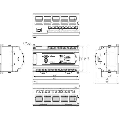 Sterownik PLC DVP32ES200R Delta Electronics zasilany jest napięciem 230 VAC o częstotliwości 47,5...63Hz. Jednostka główna została wyposażona w 16 wejść cyfrowych oraz 16 wyjść przekaźnikowych 2A. Ponadto sterownik PLC ma możliwość rozbudowy do 256 punktów wejść/wyjść. Dodatkowo DVP32SE200R dysponuje portem Ethernet, RS232 oraz RS485 z obsługą protokołu Modbus ASCII/RTU. Wydajny 32 bitowy procesor zapewnia płynną pracę urządzenia. Pamięć programu wynosi 4K. Wymiary sterownika DVP32ES wynoszą 145x110x78mm.