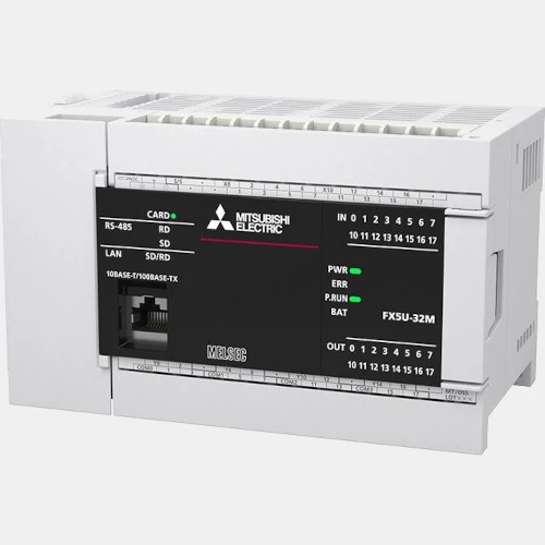Sterownik PLC FX5UC-32MT/DSS serii Melsec-FX Mitsubishi Electric o mocy 5 W zasilany napięciem 24V DC. Jednostka CPU Mitsubishi wykonana została z fabrycznie zabudowanym zasilaczem oraz procesorem centralnym. Producent w PLC FX5UC-32MT/DSS zastosował 16 wejść i 16 wyjść tranzystorowych PNP. Ponadto ma wbudowany port Ethernet, RS485, zegar czasu rzeczywistego RTC, a także slot na karty SD. Sterownik PLC Melsec FX posiada także funkcje szybkich liczników i wyjścia pozycjonujące. FX5UC-32MT/DSS Mitsubishi przeznaczony jest do pracy w temperaturze 0...55°C. PLC FX wykonany został w obudowie o stopniu ochrony IP10 i wymiarach 90 x 42 x 89 mm.