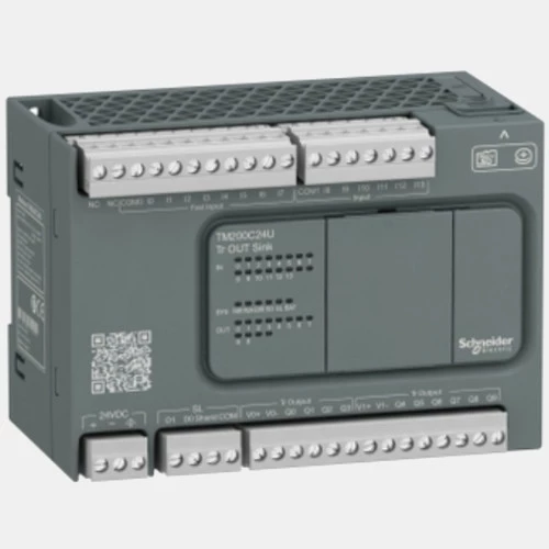 Sterownik PLC TM200C24U Schneider Electric zasilany napięciem 24 VDC. CPU TM200C24U dysponuje 16 wejściami cyfrowymi oraz 8 wyjściami tranzystorowymi 0,5A. Sterownik programowalny Easy Modicon M200 TM200C24U został wyposażony w: slot kart SD, port mini USB, port RS485, RS232. Prąd rozruchowy tego sterownika Easy Modicon M200 wynosi 35A. Kompaktowa obudowa sterownika PLC TM200C24U o stopniu ochrony IP20 przystosowana jest do montażu na szynie DIN w pozycji pionowej. Wymiary 24-punkowej jednostki głównej Modicon M200 wynoszą: 90 x 70 x 130 mm, a jej waga to 0,382 kg.