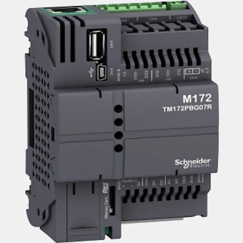 Sterownik PLC Modicon M172TM172PBG07R Schneider. Jednostka została wyposażono w: 2 wejścia binarne, 2 wejścia analogowe oraz 3 wejścia binarne. Dodatkowo ten model sterownika PLC obsługuje czujniki PT100 oraz PTC. PLC TM172PBG07R dysponuje komunikacją: CAN, Modbus TCP, Bacnet, Ethernet, port USP oraz RS485. Sterownik Modicon M172 Schneider Electric zasilany jet napięciem 24 VDC/VAC. Jednostka centralna TM172PBG07R bez wyświetlacza posiada kompaktową obudowę o stopniu ochrony IP20, przystosowaną do montażu na szynie DIN. Wymiary PLC TM172PBG07R wynoszą: 110x72x60,5mm. Waga urządzenia to: 0,175kg. Sterownik PLC M172 uzyskał następujące certyfikaty: EAC, CE, cURus, CSA, RCM.