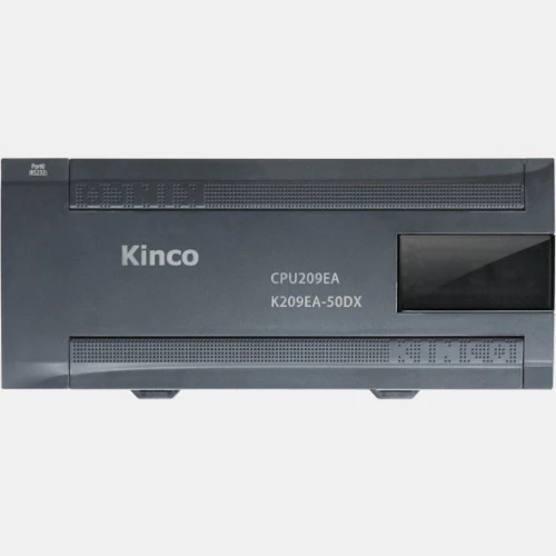 Sterownik PLC K209EA-50DX KINCO zasilany napięciem 24V DC. K209EA-50DX wyposażony został w 22 wejścia analogowe, 20 wyjść, 6 wejść analogowych, 2 wyjścia analogowe, model ten nie posiada możliwości rozszerzenia. Jednostka CPU Kinco ma wbudowane gniazdo USB, zegar czasu rzeczywistego RTC, 2 porty RS485 oraz port RS232. PLC Kinco posiada 8kB/1200 kroków pamięci programu. Kinco PLC wykonany został w obudowie o stopniu ochrony IP20 i wymiarach 215 x 90 x 70,3 mm. Sterownik K209EA-50DX Kinco programowany jest w języku LD oraz IL.