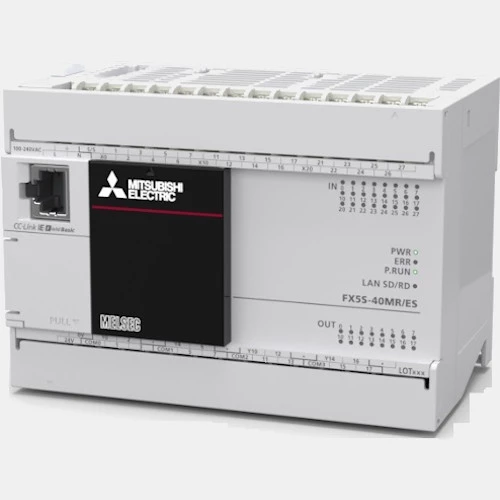 Sterownik PLC FX5S-40MR/ES serii Melsec-iQ F Mitsubishi Electric zasilany jest napięciem 24 V DC. Jednostka CPU Mitsubishi wykonana została z fabrycznie zabudowanym zasilaczem oraz procesorem centralnym. Producent wyposażył PLC FX5S-40MR/ES w: 24 wejść binarnych i 16 wyjść przekaźnikowych z możliwością rozbudowy o dodatkowe punkty wejść/wyjść. Ponadto ma wbudowany port RS485. Sterownik ten posiada 16 000 kroków pamięci. Sterownik PLC Melsec F posiada także funkcje szybkich liczników i wyjścia pozycjonujące. Kolejnym atutem tego sterownika są zainstalowane diody LED wskazujące aktualny stan wejść/wyjść. FX5S-40MR/ES Mitsubishi przeznaczony jest do pracy w temperaturze 0...55°C. PLC FX685464 wykonany został w obudowie o stopniu ochrony IP10 i wymiarach 130 x 90 x 79 mm. Waga tego sterownika PLC Mitsubishi wynosi 0,55 kg.