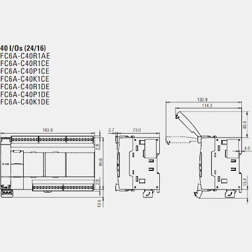 Sterownik PLC FC6A-C40K1CE producenta IDEC z serii FC6A zasilany jest napięciem 24V DC. CPU FC6A-C40K1CE wyposażony został w 24 wejścia binarne i 16 wyjść tranzystorowych NPN z możliwością rozszerzenia do 520 punktów cyfrowych oraz 126 punktów analogowych. Jednostka centralna FC6A-C40K1CE IDEC posiada także port Ethernet oraz port RS232 i RS485 i slot na karty SD. Pamięć programu dla PLC FC6A Idec wynosi 640 kB. Dodatkowo producent wyposażył jednostki w RTC oraz kalendarz z opcją synchronizacji SNTP. Konfiguracja PLC MicroSmart CPU Compact FC6A-C40K1CE odbywa się przy pomocy narzędzia WindLDR. Sterownik PLC FC6A-C40K1CE został zaprojektowany w wymiarach 163 x 90 x 73 mm. Obudowa PLC FC6A wykonana jest o stopniu ochrony IP20 i może pracować w temperaturze od -10...55 stopni Celsjusza.