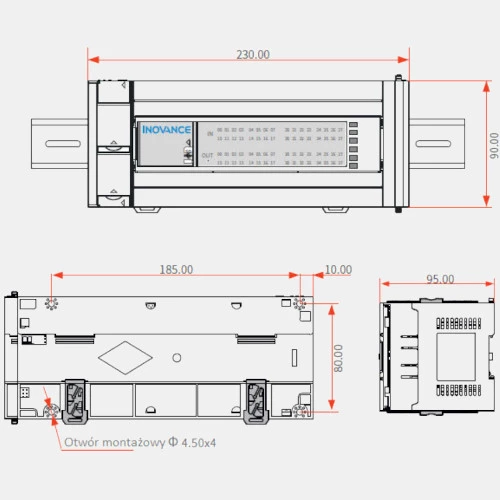 Sterownik PLC H3U-3232MR H3U producenta Inovance zasilany jest napięciem 230V AC. Sterownik programowalny H3U-3232MR został wyposażony w 32 wejścia binarne w tym 8 szybkich i 32 wyjścia przekaźnikowe. Ponadto posiada możliwość rozszerzenia lokalnie do 128 wejść wyjść cyfrowych i do 24 wejść/wyjść analogowych oraz zdalnie do 7986 wejść i wyjść cyfrowych i 1488 wej/wyj analogowych. PLC Inovance dysponuje także fabrycznie wbudowanymi portami RS232, RS485, portem Ethernet, komunikacją Modbus, CAN/ CANlink oraz wejściem USB. Jednostka centralna H3U-3232MR H3U Inovance zaprojektowana została w wymiarach 90 x 230 x 90 mm. Do programowania sterownika PLC H3U-3232MR dedykowane jest intuicyjne, darmowe oprogramowanie Autoshop. Urządzenie przeznaczone zostało do pracy w temperaturze od -5...45 °C.