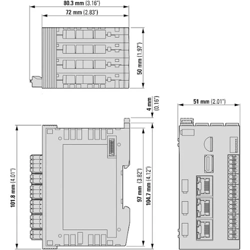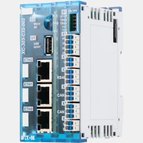 Sterownik PLC XC-303-C32-002 producenta Eaton zasilany jest napięciem 24V DC. Producent w PLC zastosował liczne interfejsy takiej jak: 3x gniazdo Ethernet, RS485, USB, 2 gniazdo CAN oraz slot na karty SD. Jednostka centralna XC-303-C32-002 posiada 4 wejścia binarne oraz 4 wyjścia cyfrowe 0,5A. Sterownik PLC XC-303-C32-002 Eaton pracuje w oparciu o szybki procesor ARM CORTEX A7 Dual Core 960MHz. Ponadto jednostka główna XC300 191080 dysponuje 512 MB pamięci RAM oraz 128 MB pamięci Flash. Sterownik 191080 Wykonany został w kompaktowej obudowie o wymiarach 104,7x50x72 mm i waży 0,3kg.