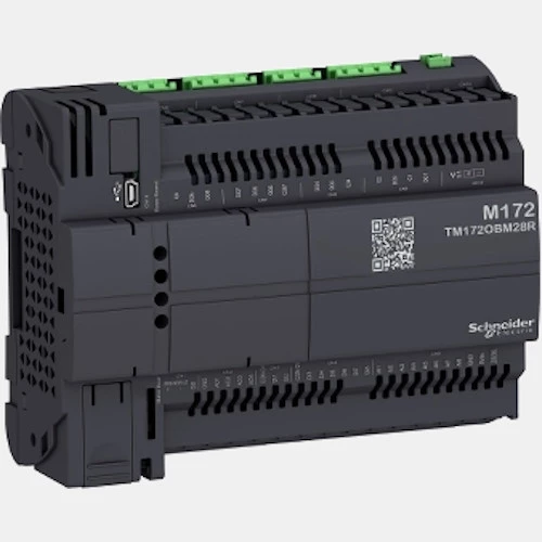 Sterownik PLC Modicon M172TM172OBM28R Schneider. Jednostka została wyposażono w: 8 wejść binarnych, 8 wejść analogowych, 4 wyjścia analogowe oraz 8 wyjąć binarnych. Dodatkowo ten model sterownika PLC obsługuje czujniki PT100 oraz PTC. PLC TM172OBM28R dysponuje komunikacją: CAN, Modbus TCP, Bacnet, port USP oraz RS485. Sterownik Modicon M172 Schneider Electric zasilany jet napięciem 24 VDC/VAC. Jednostka centralna TM172OBM28R bez wyświetlacza posiada kompaktową obudowę o stopniu ochrony IP20, przystosowaną do montażu na szynie DIN. Wymiary PLC TM172OBM28R wynoszą: 110x144x60,5mm. Waga urządzenia to: 0,3kg. Sterownik PLC M172 uzyskał następujące certyfikaty: EAC, CE, cURus, CSA, RCM.