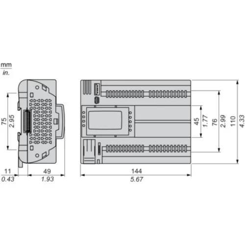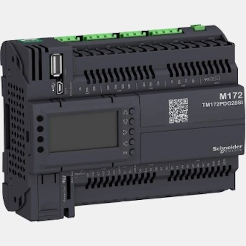 Sterownik PLC Modicon M172TM172PDG28SI Schneider. Jednostka została wyposażono w: 8 wejść binarnych, 8 wejść analogowych, 4 wyjścia analogowe oraz 8 wyjąć binarnych. Dodatkowo ten model sterownika PLC obsługuje czujniki PT100 oraz PTC. PLC TM172PDG28SI dysponuje komunikacją: CAN, Modbus TCP, Bacnet, Ethernet, port USP oraz RS485. Sterownik Modicon M172 Schneider Electric zasilany jet napięciem 24 VDC/VAC. Jednostka centralna TM172PDG28SI z wyświetlaczem LCD 128x64 pixeli posiada kompaktową obudowę o stopniu ochrony IP20, przystosowaną do montażu na szynie DIN. Wymiary PLC TM172PDG28SI wynoszą: 110x144x60,5mm. Waga urządzenia to: 0,3kg. Sterownik PLC M172 uzyskał następujące certyfikaty: EAC, CE, cURus, CSA, RCM.