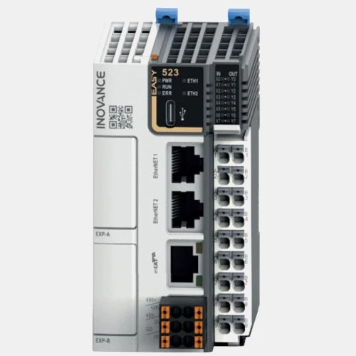 Sterownik PLC Easy523-0808TN Inovance zasilany jest napięciem 24 VDC. CPU Easy523 dysponuje 8 szybkimi wejściami do 200kHz oraz 8 wyjściami tranzystorowymi w logice NPN. Jednostka centralna EEasy523-0808TN może zostać rozbudowano o maksymalnie 32 moduły GL20 z możliwością podłączenia kart GE20. Inovance wyposażył jednostkę centralna easy 523 w porty szeregowe RS485, USB typ C oraz komunikację Modbus RTU/ASCII i wsparcie dla free protocol. Sterownik ten obsługuje do 5 osi sterowanych impulsowo. Pamięć programu producent podaje dla tej jednostki na 200 000 kroków, a pamięć danych 2 Mb. Czas wykonywania instrukcji szacowany jest na 20 000 kroków/ms. Sterownik PLC Easy Inovance obsługuje następujące języki programowania: LD, SFC, FB/FC, ST. Kompaktowa obudowa Easy523-0808TN przystosowana jest do montażu na szynie DIN a jej wymiary wynoszą: 98x105,5x53mm. Waga PLC to 197 gramy.