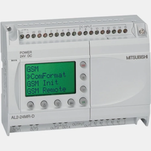 Sterownik PLC AL2-24MR-D serii ALPHA2 Mitsubishi o mocy 9 W zasilany napięciem 24V DC. AL2-24MR-D wyposażony został w 15 wejść i 9 wyjść przekaźnikowych. Jednostka CPU Mitsubishi Electric ma wbudowany port RS-232, a także liczne funkcje m.in.: licznik zdarzeń, licznik czasu oraz obsługę GSM. Sterownik PLC ALPHA 2 posiada zabudowany wyświetlacz LCD wraz z funkcyjnymi przyciskami. AL2-24MR-D Mitsubishi wykonany został w obudowie o stopniu ochrony IP20 i wymiarach 90 x 124,6 x 52 mm. Sterownik AL2-24MR-D Mitsubishi dedykowany jest do prostych aplikacji sterowania oświetleniem czy klimatyzacją.