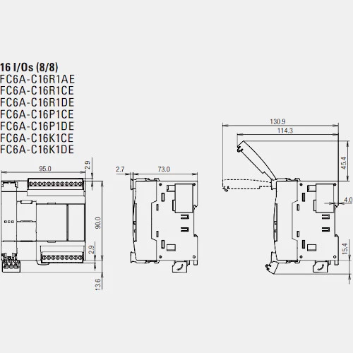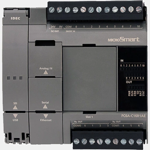 Sterownik PLC FC6A-C16R1CE producenta IDEC z serii FC6A zasilany jest napięciem 24V DC. CPU FC6A-C16R1CE wyposażony został w 9 wejść binarnych i 7 wyjść przekaźnikowych z możliwością rozszerzenia do 400 punktów cyfrowych oraz 100 analogowych. Jednostka centralna FC6A-C16R1CE IDEC posiada także port Ethernet oraz port RS232 i RS485 i slot na karty SD. Pamięć programu dla PLC FC6A Idec wynosi 640 kB. Dodatkowo producent wyposażył jednostki w RTC oraz kalendarz z opcją synchronizacji SNTP. Konfiguracja PLC MicroSmart CPU Compact FC6A-C16R1CE odbywa się przy pomocy narzędzia WindLDR. Sterownik PLC FC6A-C16R1CE został zaprojektowany w wymiarach 90 x 95 x 73 mm. Obudowa PLC FC6A wykonana jest o stopniu ochrony IP20 i może pracować w temperaturze od -10...55 stopni Celsjusza.