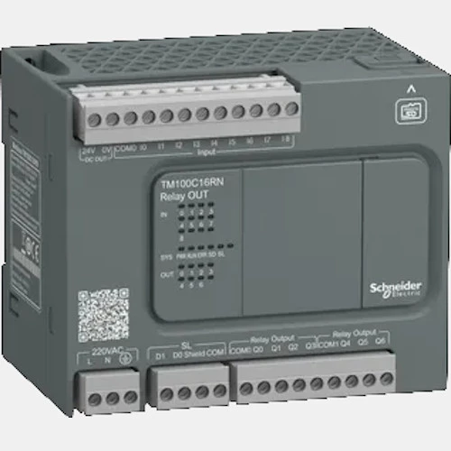 Sterownik PLC Easy Modicon M100 TM100C16RN Schneider Electric o napięciu zasilania 220 VAC. Jednostka główna została wyposażona w 9 wejść binarnych oraz 7 wyjść przekaźnikowych. Sterownik programowalny TM100C16RN został wyposażony w: slot na karty SD, złącze USB oraz porty szeregowe. Komunikacja odbywa się protokołem SoMachine-Network lub Modbus RTU/ASCII. Dodatkowo PLC M100 Schneider dysponuje sygnalizacją lokalną w postaci diody LED. Trwałość mechaniczna tej jednostki została określona na 20 000 000 cykli. Producent określa możliwość pracy PLC Easy Modicon M100 w zakresie temperatur 0...55 stopni Celsjusza. Kompaktowa obudowa CPU TM100C16RN o stopniu ochrony IP20 posiada wymiary: 90x70x110 mm. Waga sterownika wynosi 310 gram.