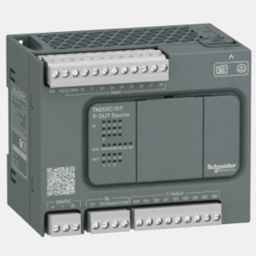 Sterownik PLC TM200C16T Schneider Electric zasilany napięciem 24 VDC. CPU TM200C16T dysponuje 9 wejściami cyfrowymi oraz 7 wyjściami tranzystorowymi 0,5A. Sterownik programowalny Easy Modicon M200 TM200C16T został wyposażony w: slot kart SD, port mini USB, port RS485, RS232. Prąd rozruchowy tego sterownika Easy Modicon M200 wynosi 35A. Kompaktowa obudowa sterownika PLC TM200C16T o stopniu ochrony IP20 przystosowana jest do montażu na szynie DIN w pozycji pionowej. Wymiary 16-punkowej jednostki głównej Modicon M200 wynoszą: 90 x 70 x 110 mm, a jej waga to 0,365 kg.