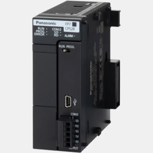 Sterownik PLC AFP7CPS2R Panasonic zasilany jest napięciem 24VDC lub za pomocą zasilacza FP. Jednostka centralna AFP7CPS2R może zostać rozbudowana do 4096 punktów wejść/wyjść z wykorzystaniem maksymalnie 64 modułów rozszerzeń. Producent określa prędkość pracy dla tego sterownika na poziomie 14ns/krok. Jednostki główne FP7 Panasonic dysponują pamięcią flash-ROM, co niweluje konieczność stosowania akumulatora zapasowego. Standardowa pamięć programu w tym modelu wynosi 64 000 kroków, zaś maksymalna 64 000 kroków. CPU AFP7CPS2R został wyposażony w port RS232. Jednostka ta dysponuje kompaktową obudową przystosowaną do montażu na szynie DIN. Wymiary jednostki głównej AFP7CPS2R wynoszą: 90x40x80mm.