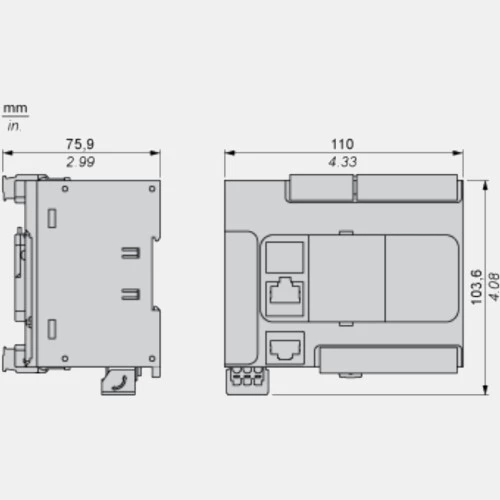Wysokowydajny sterownik PLC Modicon jest zasilany napięciem 100...240 VAC, natomiast prąd wyjść cyfrowych wynosi 2A. PLC TM221C24R posiada przełączniki start/stop oraz interfejsy tj.: port USB oraz interfejs szeregowy. Ma również możliwość rozbudowy za pomocą modułów I/O lub kaset. Obecny w sterowniku zintegrowany serwer sieciowy daje możliwość zdalnego dostępu do urządzenia, przy użyciu przeglądarki internetowej. PLC Modicon M221 jest idealnym rozwiązaniem do kompaktowych zastosowań, w których nie potrzebna jest duża ilość wejść cyfrowych, a dodatkowo potrzebne jest wejście analogowe. Wymiary TM221C24R wynoszą 110x90x70mm. Jest w stanie pracować w zakresie temperatur -10...55°C.