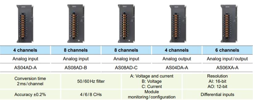 Moduły analogowe dedykowane do współpracy ze sterownikami PLC Delta Electronics AS300/AS200. W ofercie znajdują się moduły wejść analogowych, moduły wyjść analogowych, mieszane moduły analogowe oraz moduły temperaturowe. Wejścia analogowe mają rozdzielczość 16 bitów oraz czas obsługi 2ms/kanał, natomiast wyjścia analogowe są 12 bitowe z czasem obsługi 2 ms/kanał. W zależności od wykonania dostępne są moduły z wejściami prądowymi, napięciowymi, a także z wejściami analogowymi prądowo-napięciowymi. Delta proponuje moduły wejściowe w konfiguracji 4 lub 8 wejść analogowych. Moduł wyjść analogowych dostępny jest w konfiguracji 4 wyjść prądowo-napięciowych. Dodatkowo dostępny jest moduł w konfiguracji 4 wejścia i 2 wyjścia analogowe.
