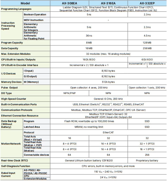 Delta oferuje jednostki główne AX-300 w wykonaniu z zabudowanymi wejściami/wyjściami lub bez wbudowanych punktów I/O. PLC AX-324 zostały wyposażone w 16 wejść cyfrowych praz 8 wyjść tranzystorowych PNP. Dodatkowo producent oferuje PLC AX-3 w wykonaniu z EtherCat. W standardzie wszystkie jednostki dysponują slotem na karty micro SD, portem USB, portem Ethernet oraz portami szeregowymi RS232 i RS485. Zabudowany port Ethernet obsługuje protokół: Ethernet/IP, Modbus TCP/IP, OPC (UA), CANopen. Możliwości sterownika PLC AX300 Delta można rozbudować z wykorzystaniem modułów rozszerzeń z serii AS. Jednostkę główną można rozszerzyć o maksymalnie 32 moduły, w tym tylko 16 analogowych.
