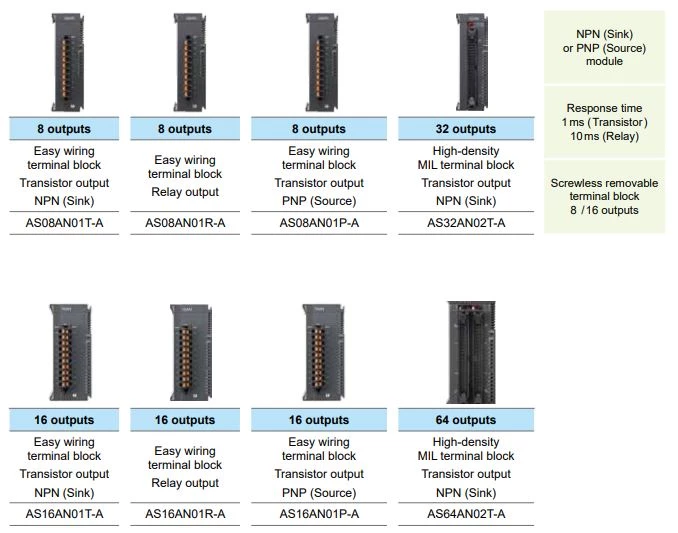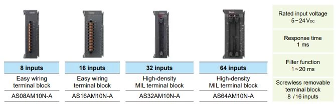 Moduły binarne dedykowane do sterowników PLC Delta Electronics AS300/AS200. W ofercie znajdują się moduł wejść cyfrowych, moduły wyjść cyfrowych a także moduły mieszane. Delta oferuje moduł 8 wejść cyfrowych oraz moduł 16 wejść ze złączem zaciskowym. Moduły 32- oraz 64 wejść binarnych zostały wyposażone w złącze MIL. W przypadku modułów mieszanych dostępne są w wykonaniu 8 wejść oraz 8 wyjść ze złączem MIL. Poszczególne moduły różnią się tylko rodzajem wyjść cyfrowych. Dostępne za z wyjściami tranzystorowymi PNP, tranzystorowymi NPN oraz przekaźnikowymi. Rozszerzenie wyjść binarnych 8-oraz 16 punktowe występują w wykonaniu z wyjściami przekaźnikowymi, tranzystorowymi PNP lub NPN. Natomiast moduły 64 oraz 32 wyjść dostępne są tylko w logice NPN. Moduły z wyjściami przekaźnikowymi dysponują złączem zaciskowym, natomiast rozszerzenia wyjść tranzystorowych posiadają złącze MIL.