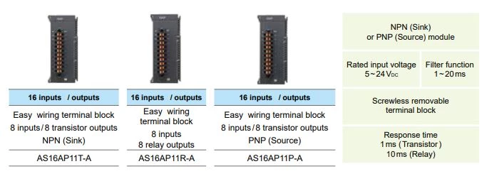 Poszczególne sterowniki PLC AS200/AS300 Delta Electronics różnią się od siebie ilością wejść oraz wyjść. Występujące modele posiadają 8 lub 16 wejść oraz 12 lub 16 wyjść. Wybrane modele posiadają dodatkowo 2 wejścia oraz wyjścia analogowe. CPU można swobodnie rozszerzyć za pomocą modułów nawet do 1024 punktów oraz 32 modułów prawostronnych.