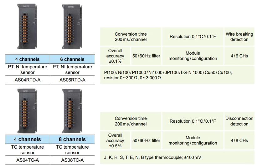 Oprócz modułów wejść/wyjść analogowych Delta Electronics posiada rozszerzenie temperaturowe. W zależności od moduły dostępne są moduły obsługujące czujniki temperaturowe rezystancyjne jak i typu termopara. Delta Electronics oferuje moduły analogowe temperaturowe 4, 6 oraz 8 punktowe. Rozdzielczość modułów 0,1 stopnia C. Dodatkowo jest możliwość konfiguracji do 100 pomiarów. 200ms wynosi czas przetwarzania na kanał funkcji wykrywania kabla.