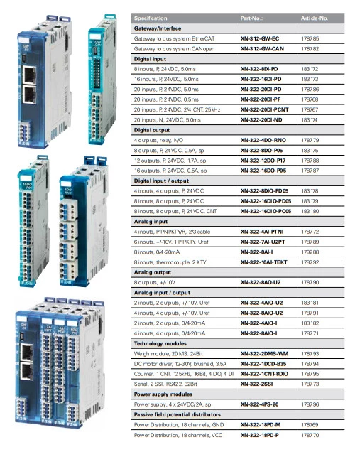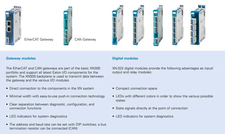 Systems ZI/On Eaton charakteryzuje się dużą modułowością oraz kompaktową konstrukcją. Ponadto producent udostępnia kompleksowe wyposażenie dodatkowe oraz prostą i skuteczną diagnostykę urządzeń. Kolejnym atutem jest łatwa, intuicyjna obsługa. Moduły gateway Xi/ON Eaton odsługują komunikacje CANopen, Profibus-DP, DeviceNet oraz Ethernet. Tak szerokie możliwości komunikacyjne pozwalają na podłączenie sterowników PLC Eaton do urządzeń różnych producentów. Kolejną zaletą są udostępnione precyzyjne funkcje kalibracji modułów XI/ON, dzięki temu dostosowanie systemu do indywidualnych potrzeb aplikacji jest jeszcze prostsze. Oprócz modułów komunikacyjnych dostępne są również moduły cyfrowe, moduły analogowe, moduły enkoderowe.