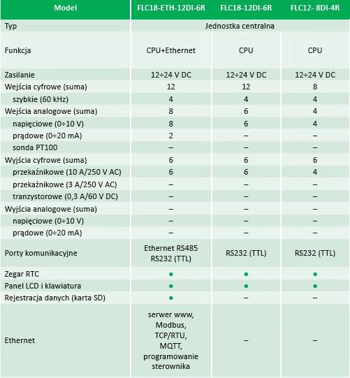 Jednostki główne FLC F&F zostały wyposażone w wyświetlacz LCD z 4 liniami po 16 znaków oraz w 6 przycisków funkcyjnych. Jednostki zasilane są napięciem 12-24 VDC. W zależności od wykonania CPU dysponuje 12 lub 8 wejściami cyfrowymi w tym 4 szybkie 60 kHz oraz 6 wyjściami przekaźnikowymi. PLC FLC18 F&F mają możliwość rozbudowy do 16 prawostronnych modułów rozszerzeń. W standardzie jednostki zostały wyposażone w wejścia analogowe prądowo-napięciowe. producent wyposażył CPU w port szeregowy RS232 (TTL), dodatkowo dostępna jest jednostka z portem Ethernet i RS485. Ponadto CPU FLC zostały wyposażone w zegar czasu rzeczywistego RTC, podtrzymywanie bateryjne, z funkcjami astronomicznymi oraz kalendarzem, co daje możliwość tworzenia rozbudowanych aplikacji zegarowych. programowanie sterowników FLC odbywa się przy pomocy bloków funkcyjnych, jednostki FLC18 mają możliwość zaprogramowania do 1024 bloków funkcyjnych, natomiast FLC12 do 512 bloków funkcyjnych. Ponadto producent wyposażył urządzenia w dużą liczbę funkcji logicznych oraz bloków funkcyjnych. Dodatkowo użytkownik ma możliwość tworzenia własnych bloków funkcyjnych. Jednostki główne FLC F&F zostały wyposażone w kompaktowe obudowy z tworzywa o stopniu ochrony IP20 przystosowaną do montażu na szynie DIN. Kolejnym atutem jest szeroki zakres temperatur, producent deklaruje możliwość pracy urządzeń w temperaturach od -20 do +55 stopni Celsjusza.